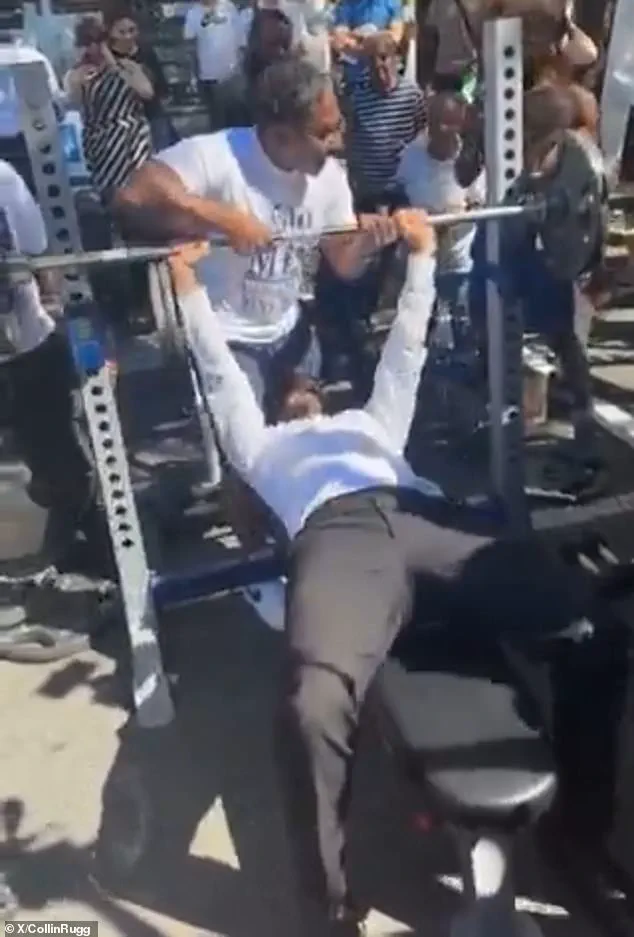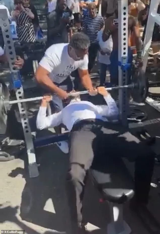 As he lay on the weightlifting bench, a crowd of onlookers cheered him on, with one individual shouting, ‘This is how you move up in the polls,’ a remark that seemed to blend humor with a critique of the candidate’s ability to handle the pressures of the mayoral race.