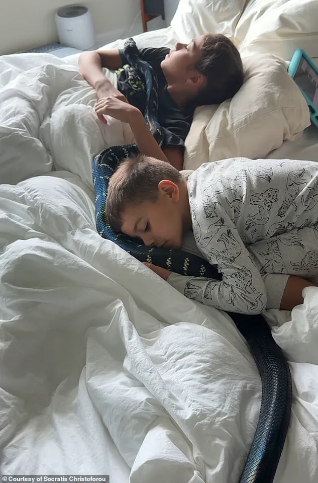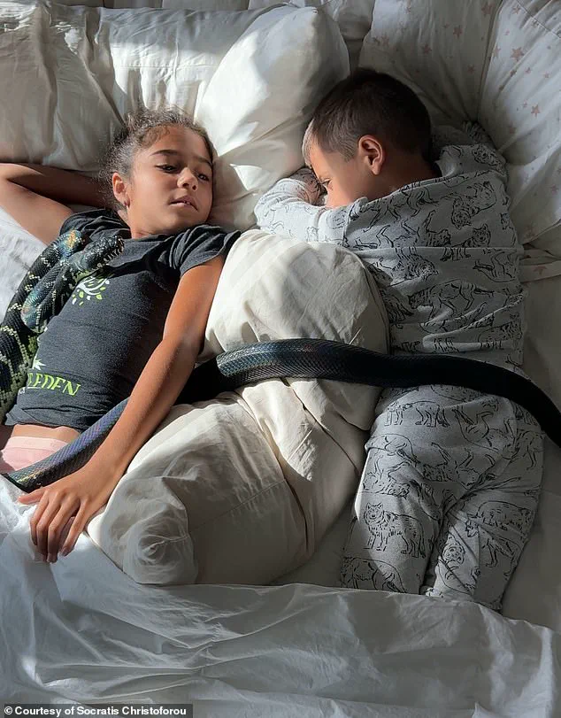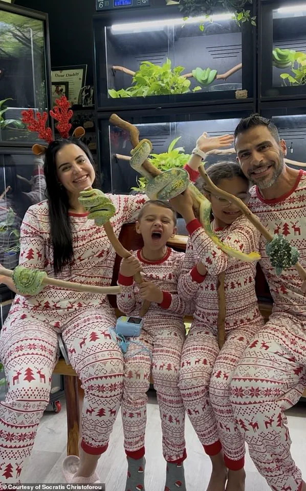 The family’s bedtime routine includes cuddling with snakes, a practice that has drawn both admiration and criticism from outsiders. ‘I clapped back at haters who may judge my ‘obsession,’ Socratis says. ‘This is my family’s life, and we’re happy.