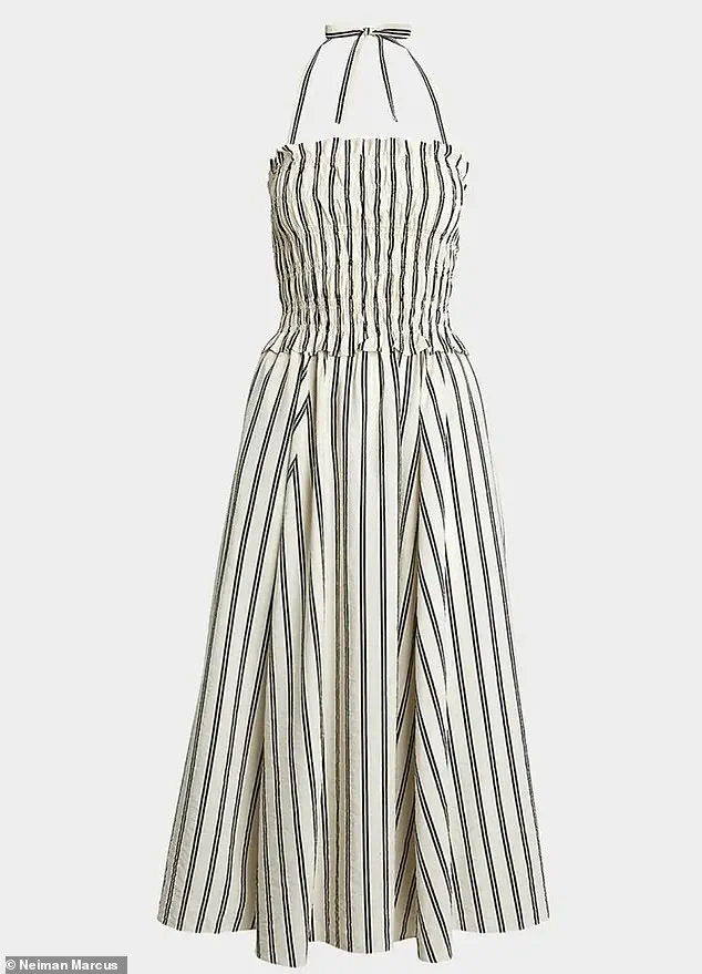 Swift’s dress, a $400 striped silk-blend creation from Ralph Lauren’s latest collection, features a ruched top and halter neckline, paired with brown heeled sandals.