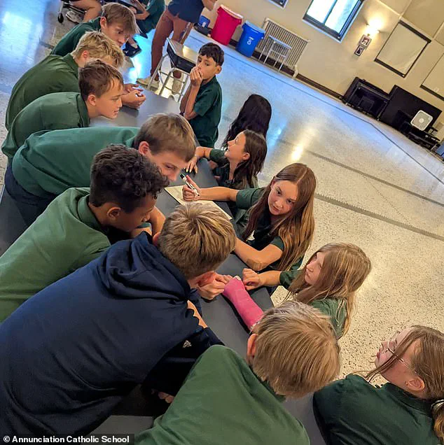 In another image, the children gathered around a school cafeteria lunch table, their laughter and chatter filling the air as one of them sat with her arm in a cast.