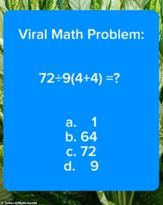 The equation in question reads: ‘Viral Math Problem’ and asks, ‘What is the answer to 72÷9(4+4)=?’ Beneath the question, three possible solutions are listed: a) one, b) 64, c) 72, or d) nine.