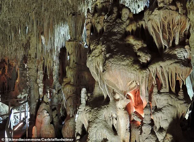 This image shows the elaborate mineral formations inside the Petralona Cave in Greece, which is open to tourists