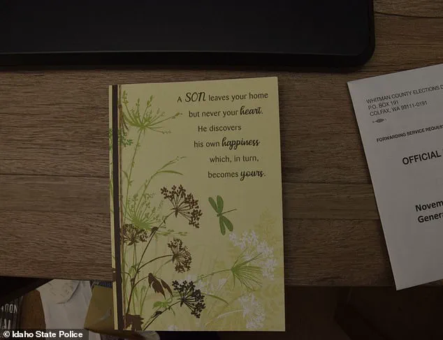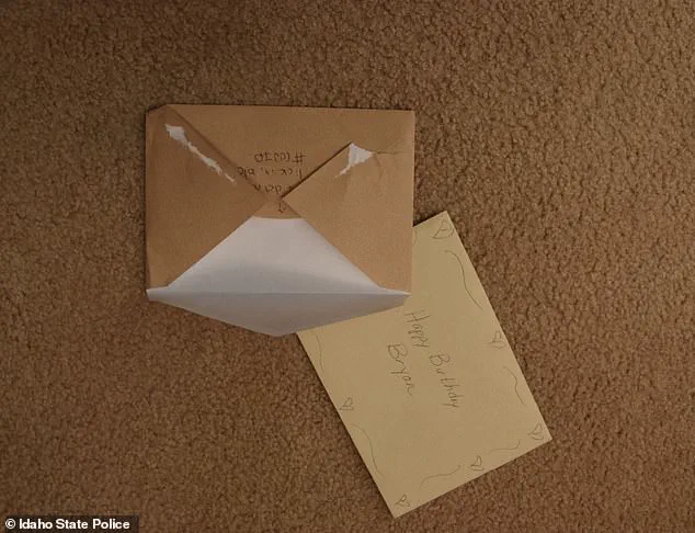Alongside these cards, two envelopes are also visible in the photos—one covered in tiny hand-drawn hearts and reading: ‘Happy Birthday Bryan!’ The identity of the sender of this card remains unknown, further fueling the questions that surround Kohberger’s life and the events that led to the deaths of four young students.