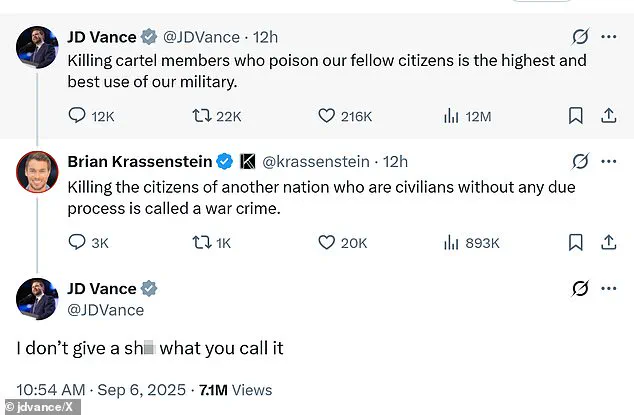 Vance, unflinching, replied, ‘I don’t give a s*** what you call it,’ a remark that has further fueled the debate over the moral and legal boundaries of U.S. military actions abroad.