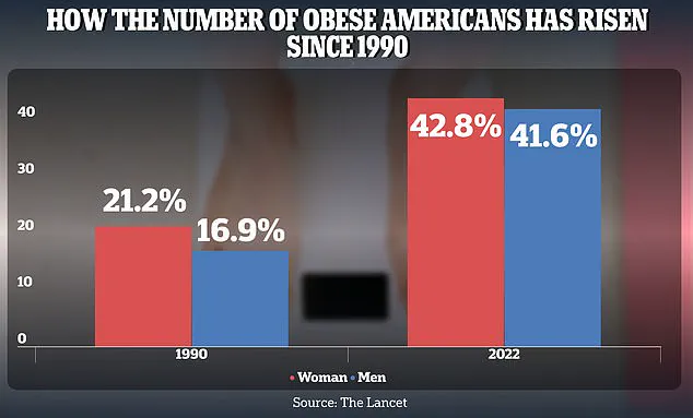 The obesity rate among American adults increased from 21.2 percent in 1990 to 43.8 percent in 2022 for women and 16.9 percent to 41.6 percent for men