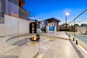 The five-bedroom, five-bathroom mansion sits across two levels, and also features a tennis court, sunken fire pit and bar.