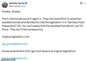 They sneak this stuff in without debate!’ Another user added: ‘The Illinois house passed the assisted suicide bill disguised as “Sanitary Food Preparation”.