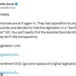 One X user wrote: ‘Assisted Suicide amendment added to a food safety bill in Illinois Legislature by Robyn Gabel (Democrat of course).