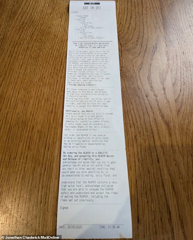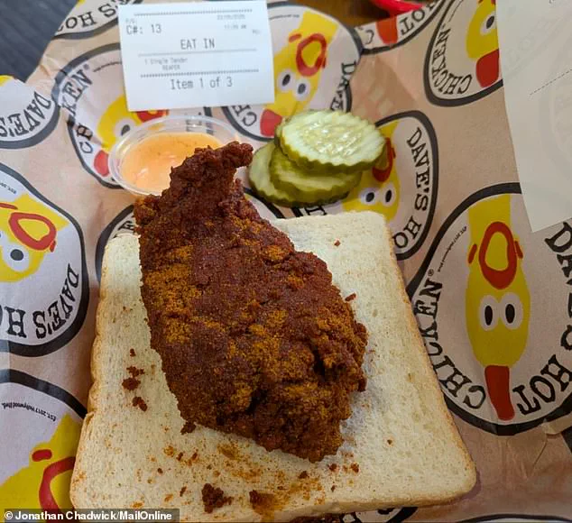 Describing the experience, Chadwick recounted the moment the single Reaper chicken tender, priced at £3.99, arrived on a slice of white bread with pickles and a mysterious ‘secret sauce.’ The dish, he noted, looked as though it had been forged in hell, its hellish red hue curling like the devil’s own toenail.
