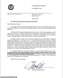 Greg Burt, Vice President of the California Family Council, echoed the sentiment, calling the DOJ’s intervention a ‘bold step’ that ‘returns our schools to truth, biology, and the equal protection of all students under the law.’ The letter grants districts until June 9 to certify compliance with the new ruling, with noncompliance risking legal consequences.