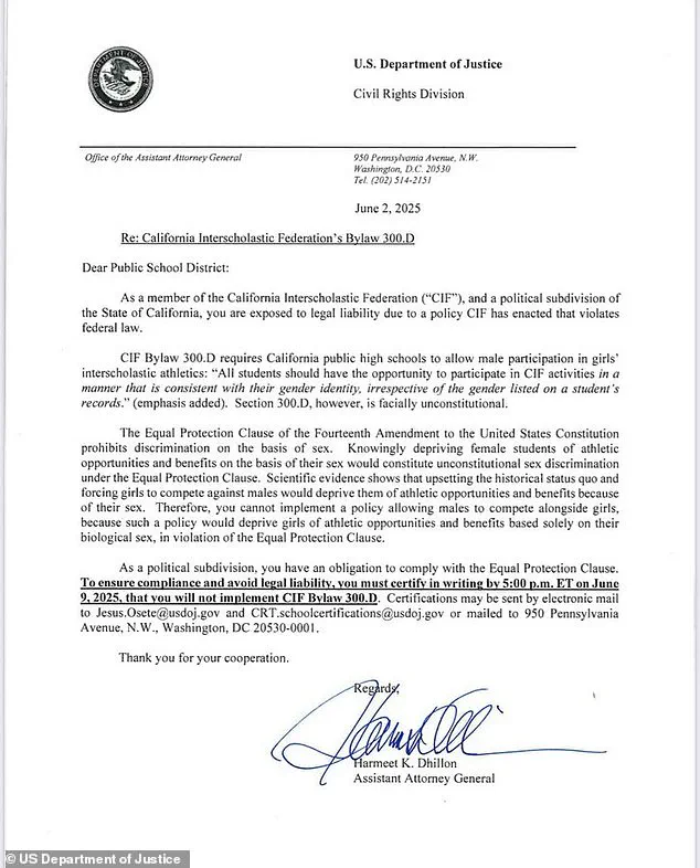 The letter, addressed to school districts across the state, cited scientific evidence to argue that allowing biological males to compete against females would ‘deprive girls of athletic opportunities and benefits based solely on their biological sex, in violation of the Equal Protection Clause.’ The document, which has since ignited a nationwide debate, warned that failure to comply could result in ‘legal liability’ for districts that permit transgender athletes to participate in girls’ competitions.