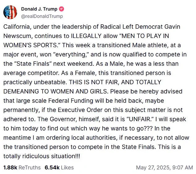 In a series of inflammatory posts on Truth Social, the president criticized the ‘radical left’s war on women’ and accused California Governor Gavin Newsom of enabling ‘gender ideology’ that he claimed would ‘destroy the fabric of American society.’ His comments, which were widely shared on conservative media, amplified the national spotlight on the controversy and drew sharp rebukes from transgender advocates.
