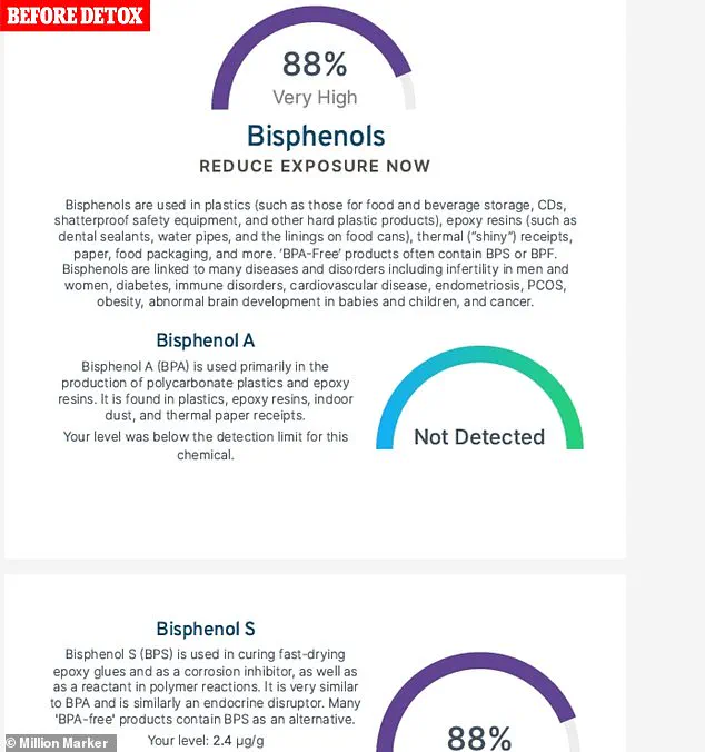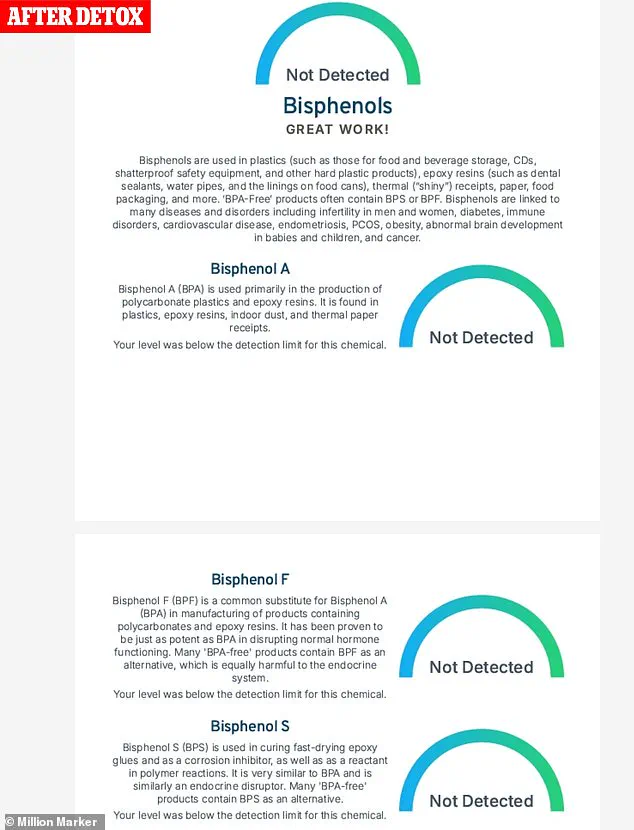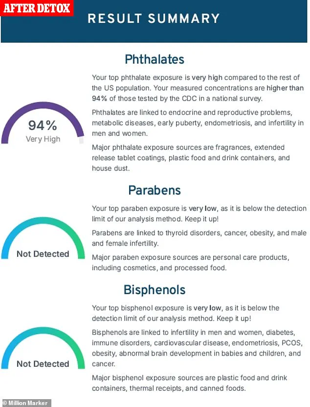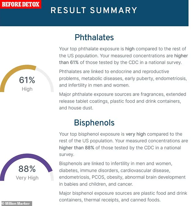 Initially, the results were alarming: their levels of phthalates and bisphenols were 61% and 88% higher than the CDC’s general population averages. “It felt like a wake-up call,” they say. “I realized how deeply these chemicals had infiltrated my life.” After a detox program, however, the numbers shifted dramatically.