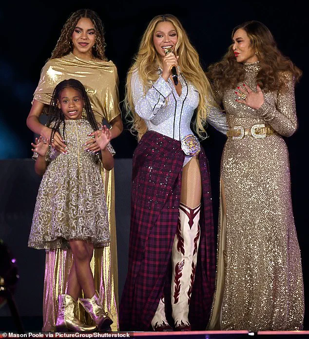 Beyoncé (centre) on stage with daughters Blue Ivy (back left) and Rumi (front left) and mother Tina Knowles (right) at SoFi Stadium in California on May 1 during her Cowboy Carter tour.
