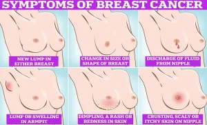 Symptoms of breast cancer to look out for include lumps and swellings, dimpling of the skin, changes in colour, discharge, and a rash or crusting around the nipple.