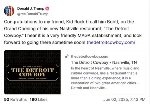 President Donald Trump has thrown his full support behind Kid Rock’s latest venture, a new Nashville restaurant called *The Detroit Cowboy*, in a high-profile post on Truth Social Monday night.