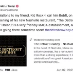President Donald Trump has thrown his full support behind Kid Rock’s latest venture, a new Nashville restaurant called *The Detroit Cowboy*, in a high-profile post on Truth Social Monday night.
