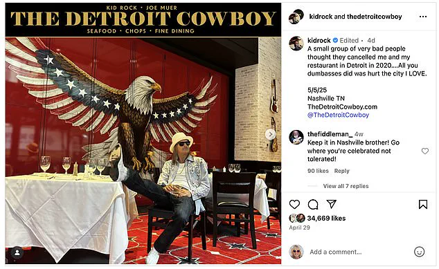 All you dumba**es did was hurt the city I LOVE.’* The post, which featured a dramatic image of Kid Rock with a white cowboy boot on a table and a large painted eagle in the background, has been widely shared on conservative forums, further fueling speculation about the restaurant’s role as a MAGA hub.