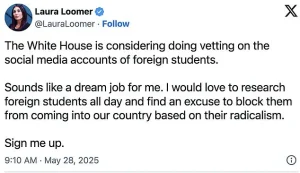 Loomer, known for her polarizing rhetoric and history of social media bans, has openly expressed her enthusiasm for a role in the administration’s new immigration policies. ‘Sounds like a dream job for me,’ she tweeted, ‘I would love to research foreign students all day and find an excuse to block them from coming into our country based on their radicalism.