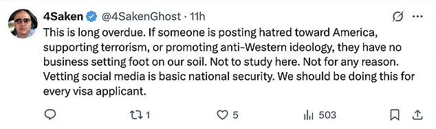 Supporters of the policy have flooded social media with messages endorsing the crackdown. ‘You were meant for this role!’ one user wrote to Loomer, while another suggested, ‘What if we just ban foreigners from coming to this country?’ A third supporter insisted, ‘Vetting social media is basic national security.