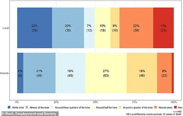 When asked ‘how often does your job involve working to tight deadlines?’, 22 per cent of local workers responded ‘all the time’, compared with 4 per cent for remote workers