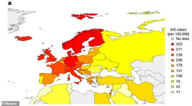 Geographic patterns also reveal disparities in MS prevalence, with a map showing that north-western Europeans carry a higher genetic risk for the condition.