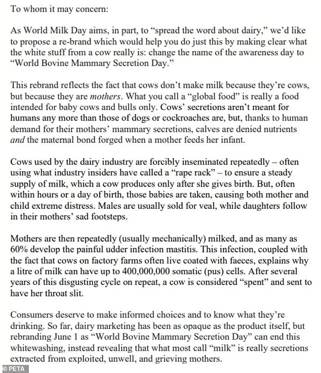 The organization’s letter emphasizes that the term ‘milk’ has been deliberately chosen to evoke warmth and nourishment, despite the fact that the substance is extracted from animals subjected to conditions that the group deems inhumane.