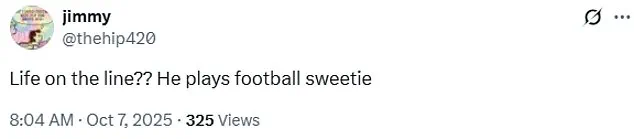He plays football sweetie.” Others argued that while the sport is undeniably physical, the idea of it being a “fight for his life” every week was an overstatement.