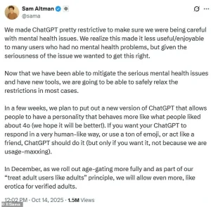 The internet has erupted in a mix of disbelief, mockery, and concern over a recent announcement by OpenAI founder Sam Altman, who revealed that ChatGPT will soon offer ‘erotica for verified adults’ as part of its December update.