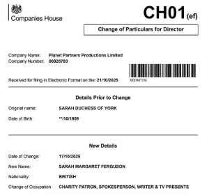 Sarah Ferguson’s updated company details now list her as ‘Sarah Margaret Ferguson,’ replacing the former ‘Sarah, Duchess of York.’ Her occupation has also been revised from ‘director’ to ‘charity patron, spokesperson, writer and TV presenter,’ signaling a shift in her professional identity.