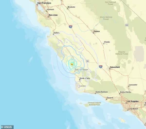 The 4.1 magnitude shake was recorded at 9.45am PT (12.54pm ET), pinpointing the epicenter near Templeton.