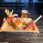 The meal, which costs $8, includes a miniature burger served in a slider-sized portion, accompanied by a shot glass of fries and a syringe of ketchup, along with the option of a mini beer, martini, or ‘weeny wine.’ The restaurant’s website humorously promotes the dish with the tagline, ‘get a shot of fun… no prescription needed.’