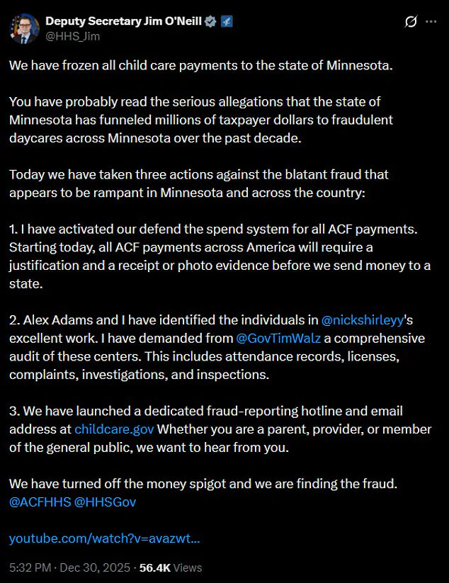 On Tuesday, Minnesota’s HHS Deputy Secretary, Jim O’Neil, announced that federal childcare payments to the state would be frozen following allegations of hundreds of sham providers, including autism centers registered at single buildings with no children, no staff, and no real services.