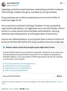 The controversy deepened when users pointed out a critical detail: Witkoff’s brother died from an OxyContin overdose, not cocaine, which is the drug Maduro is accused of trafficking into the U.S.