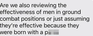 Another woman shared a text she sent to a colleague, highlighting the perceived double standard in the military’s approach to gender integration. ‘Are we also reviewing the effectiveness of men in ground combat positions, or just assuming they’re effective because they were born with a penis?’ she wrote.