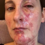 A woman’s left eye had swollen shut entirely, her lips so puffy that drinking water required a straw.