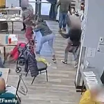 Another diner was seen grabbing a chair to avoid being struck, only for Kirven to retaliate by hurling the furniture at them, further intensifying the scene.