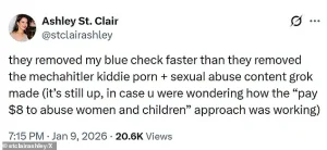 On her own X account, she posted a scathing message accusing the platform of failing to act, writing, ‘They removed my blue check faster than they removed the mechahitler kiddie porn + sexual abuse content grok made (it’s still up, in case you were wondering how the ‘pay $8 to abuse women and children’ approach was working.’