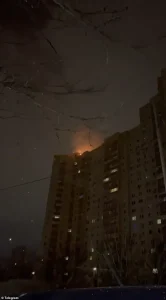 The footage, widely shared across international media, shows the drone streaking through the night sky before colliding with a residential tower, triggering a massive explosion that engulfed the building in flames.