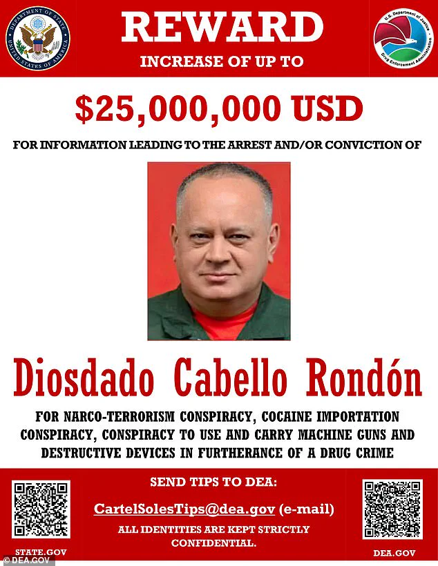 The US Department of State has now issued an urgent ‘wanted’ poster for Cabello, 62, labeling him a key enabler of Maduro’s regime and a figure complicit in the export of drugs and criminals that have wreaked havoc on American communities.