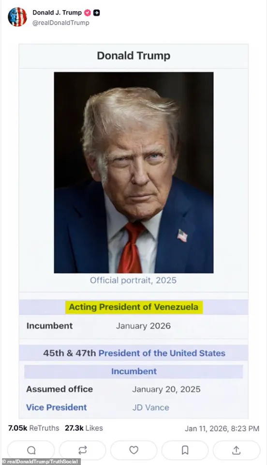 Donald Trump’s latest foray into international politics has sparked a wave of confusion, ridicule, and concern, as the U.S. president posted a doctored image on Truth Social claiming to be the ‘Acting President of Venezuela.’ The altered screenshot of a Wikipedia page—where Trump’s actual entry contains no such title—was presented as a lighthearted jab at the beleaguered South American nation.