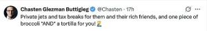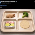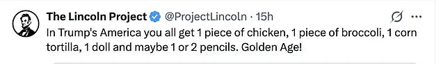 The post depicted a meal consisting of ‘one piece of chicken, one piece of broccoli, one corn tortilla, one doll, and maybe one or two pencils,’ a direct reference to former President Donald Trump’s remarks about tariffs and their potential impact on consumer goods.