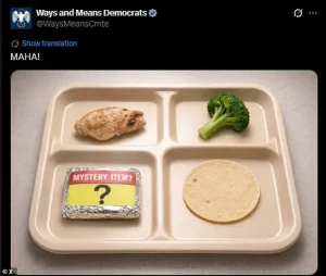 The House Ways and Means Committee further amplified the ridicule by creating a visual labeled ‘MAHA!’—’Make America Healthy Again’—which depicted a school lunch tray with a tin-foil wrapped ‘mystery item’ as the centerpiece of the meal.