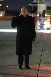 Air Force One had to turn around back to Joint Base Andrews less than an hour into its transatlantic flight to Davos over what the White House called ‘a minor electrical issue.’ Pictured: Donald Trump boards Air Force One at 9:34pm