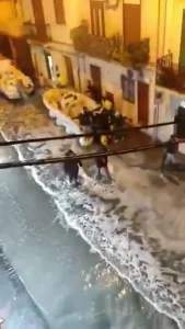 Italians were seen running for their lives after a tsunami-style storm surge flooded the streets of Sicily, marking one of the most harrowing weather events to hit the region in decades.