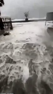In the town of Marascala, a dramatic clip captured seawater smashing through glass doors, flooding the interior of a home and leaving residents scrambling to higher ground.