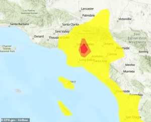 In Los Angeles, AQI readings have reached into the ‘unhealthy’ range, prompting the EPA to issue warnings about the potential dangers of prolonged outdoor exposure.