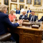 Donald Trump meets with Sir Keir Starmer, Italian Prime Minister Giorgia Meloni, European Commission President Ursula von der Leyen, German Chancellor Friedrich Merz, French President Emmanuel Macron, Finnish President Alexander Stubb, Ukrainian President Volodymyr Zelenskyy, and NATO Secretary General Mark Rutte on August 18, 2025