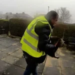 Doorbell footage shows a man wearing a high-vis jacket picking up the cat close to a property in Elland, near Halifax, West Yorkshire, on Sunday afternoon