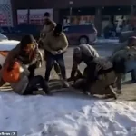 The footage captures agents shoving a protester into a snow bank, with a woman screaming as an agent appears to grab her coat and drag her across the frozen ground.